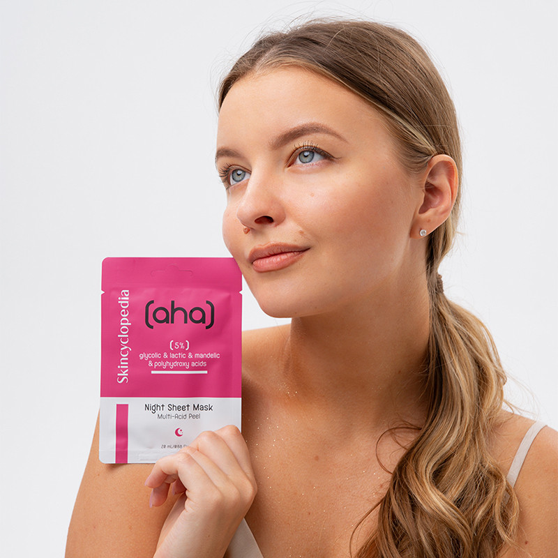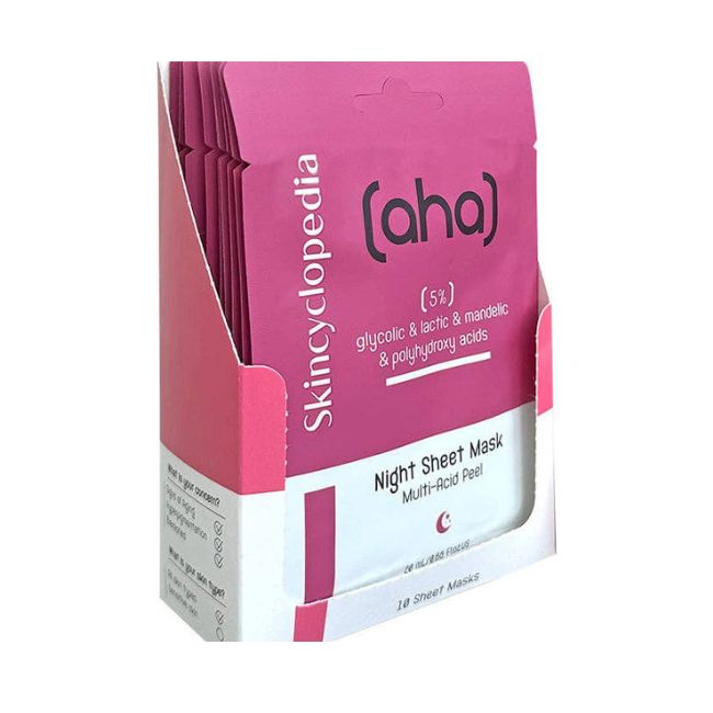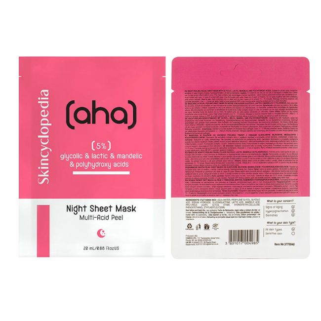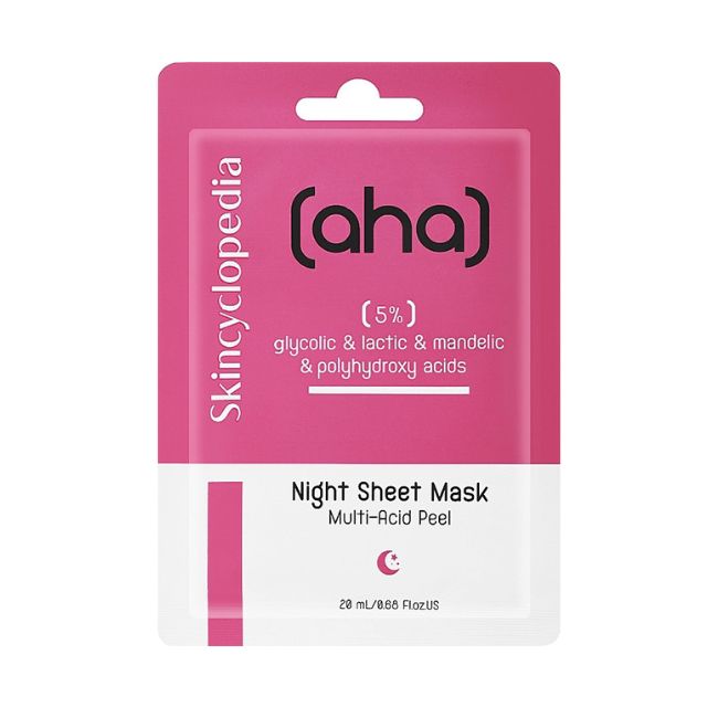 מסיכת הבד של Skincyclopedia ללילה משלבת 5% חומצות AHA ו-PHA, המיועדות לקילוף עדין, התחדשות תאי העור והבהרה.